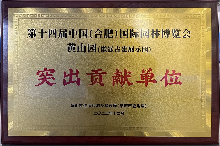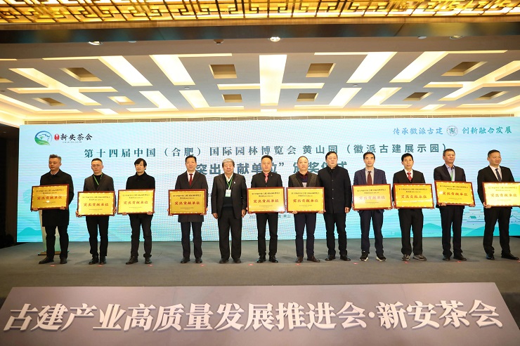 12月18日下午,中國(黃山)第三屆徽派古建產(chǎn)業(yè)發(fā)展大會古建產(chǎn)業(yè)高質(zhì)量發(fā)展推進會·新安茶會舉行。推進會上頒發(fā)了第十四屆中國(合肥)國際園林博覽會黃山園(徽派古建展示園)“突出貢獻單位”獎項,作為黃山園項目參建單位之一的黃山建工集團再獲殊榮。