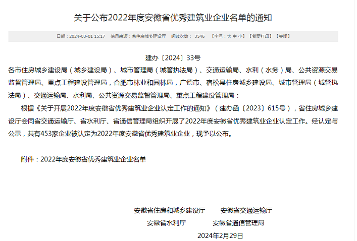 近日,安徽省住房和城鄉(xiāng)建設(shè)廳發(fā)布了“2022年度安徽省優(yōu)秀建筑業(yè)企業(yè)”名單,黃山建工集團(tuán)憑借企業(yè)經(jīng)營發(fā)展、管理創(chuàng)新能力、企業(yè)建造能力、企業(yè)文化建設(shè)、社會責(zé)任履行等方面的卓越表現(xiàn)再次名列榜單――建筑工程總承包類(特級、一級類別)省優(yōu)秀建筑業(yè)企業(yè),連續(xù)多年斬獲該項殊榮。