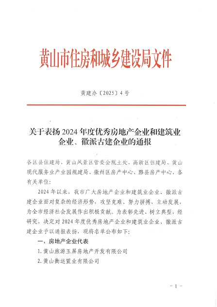 近日,黃山市住房和城鄉(xiāng)建設(shè)局發(fā)布了《關(guān)于表?yè)P(yáng)2024年度優(yōu)秀房地產(chǎn)企業(yè)和建筑業(yè)企業(yè)、徽派古建企業(yè)的通報(bào)》,黃山建工集團(tuán)榮獲2024年度優(yōu)秀建筑業(yè)企業(yè)稱號(hào)。